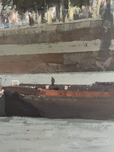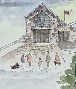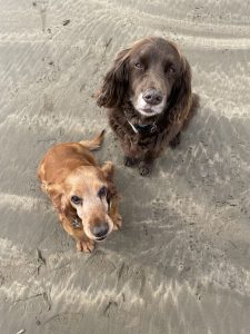In my own work, I often include small figures of my two cocker spaniels, Simon and Celeste. They don’t appear in every piece, but they turn up often enough to be recognised. You might find them frolicking on a lifeboat ramp in Appledore or leaping about on a riverside path in Stockbridge. Simon is a chocolate brown working cocker spaniel, and Celeste is a fox red show cocker, and they slip into my compositions in different ways each time.